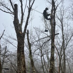 木に登って作業するご主人と、その作業を地上でサポートする奥さん。